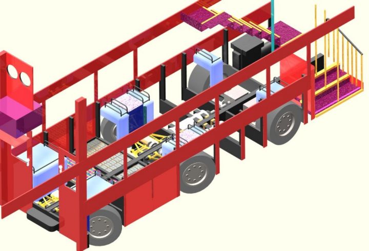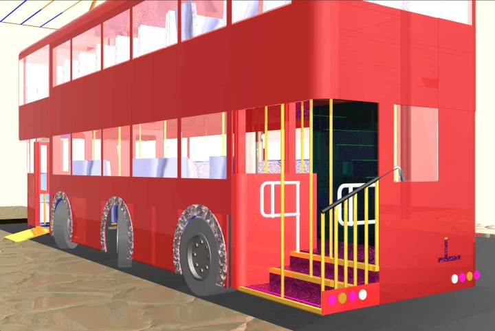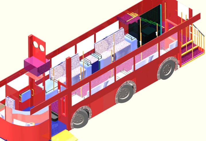 These CAD drawings were produced by one of our members and entered into the Boris Johnson; Mayor of London New Route Master bus competition. The proposed bus can be powered by an on-board diesel engine, an overhead power supply, or battery. The configuration of the bus is easily changed by removing and inserting various modules into the side of the bus between the wheels.