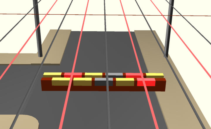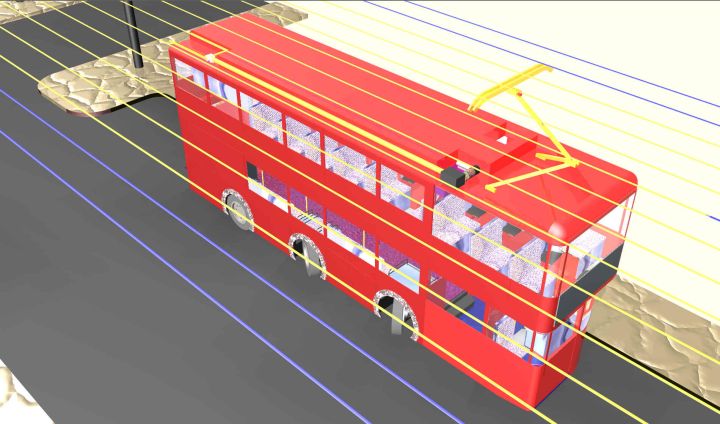 Looking at the picture below shows the interaction between the power supply lines and the pantograph. Under each segment are rectified diodes; so whichever section of the pantograph is powered, the bus it is still able to be powered.