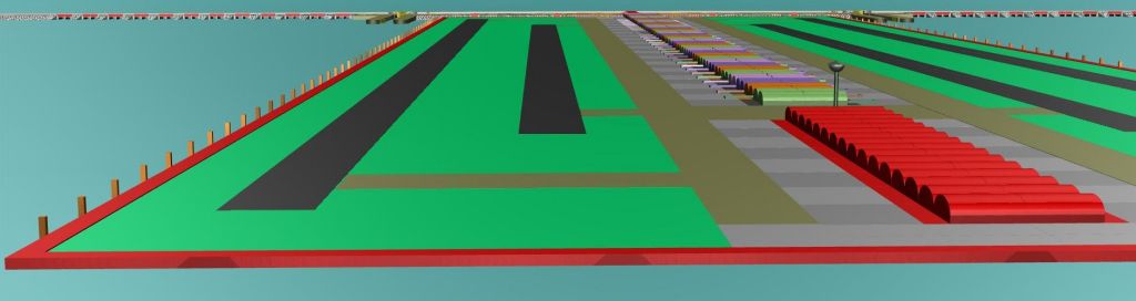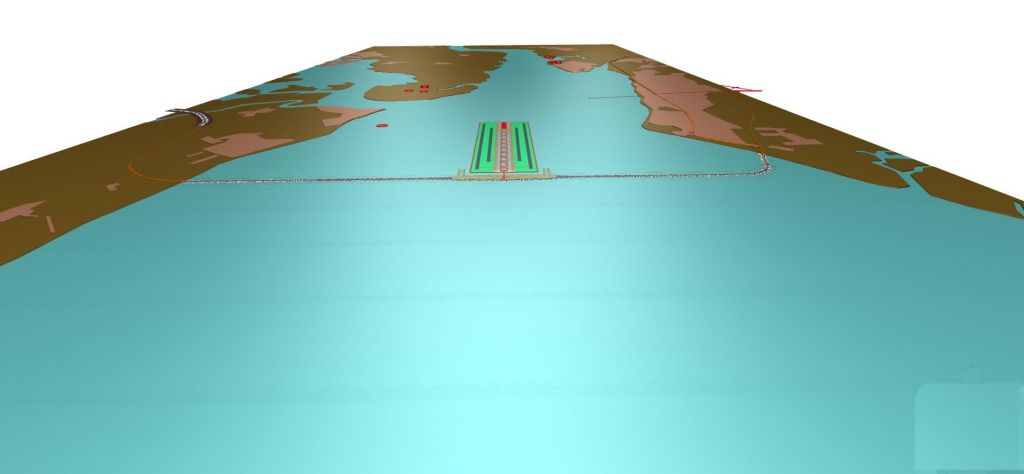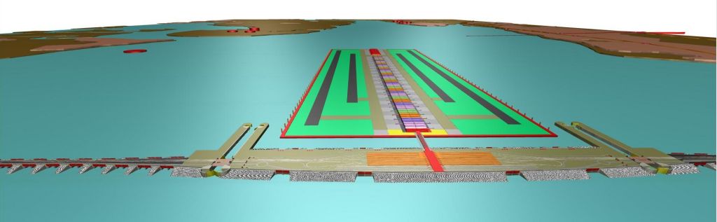 The above view shows the West end of the airport. To the extreme left you can see the piles that hold the airport in place then we have the two runways, taxiway and the airport stands and terminals. The buildings in red are for freight traffic and airport services. Towards the top of these red buildings you can see the airport control tower.