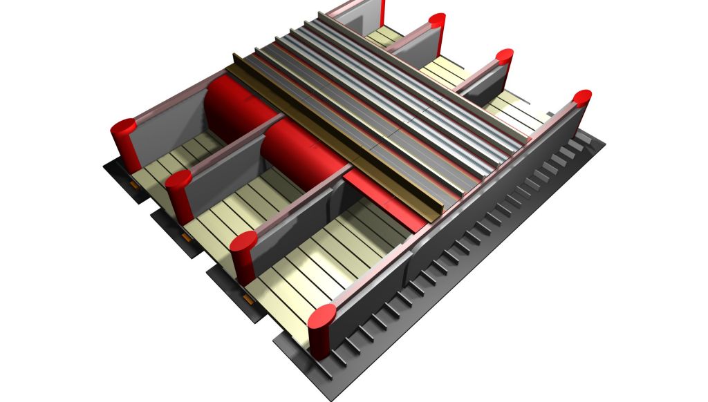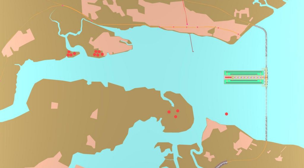 The above drawing shows the proposed scheme for the dam gates. You will immediately notice that there are no foundations included. As we are having to build on clay this is a very specialised engineering skill. To build the structure immediately on clay could lead to catastrophe. My initial idea without further consultation is that the whole structure would be constructed on a thick layer of ballast. This idea may seem illogical as it would allow sea water to seep through but it cannot be broken down in the same way the clay can. The red ovals at each end of the peers are the only fixture that penetrates through the clay into bedrock. These piles stop the peers from tilting and hold them in position. To compensate for the clay foundations the peers are extended lengthwise. Not only does this give greater stability but it allows for the floodgates to be rolled out horizontally so they can be serviced. At the rear of the gates this space allows for the possibility of hydroelectric schemes to be installed. The cream coloured blocks will be concrete blocks that are not fixed into position therefore they have some amount of movement. They can also be withdrawn and replaced if they wear out. The entire structure is constructed in a way that it can move slightly and still function. On top of the flood defence scheme you will see the sea wall, two dual carriageways, railway tracks for a light rail system and railway tracks for the mainline system. The flood defence gates are kept under this infrastructure when not required.
