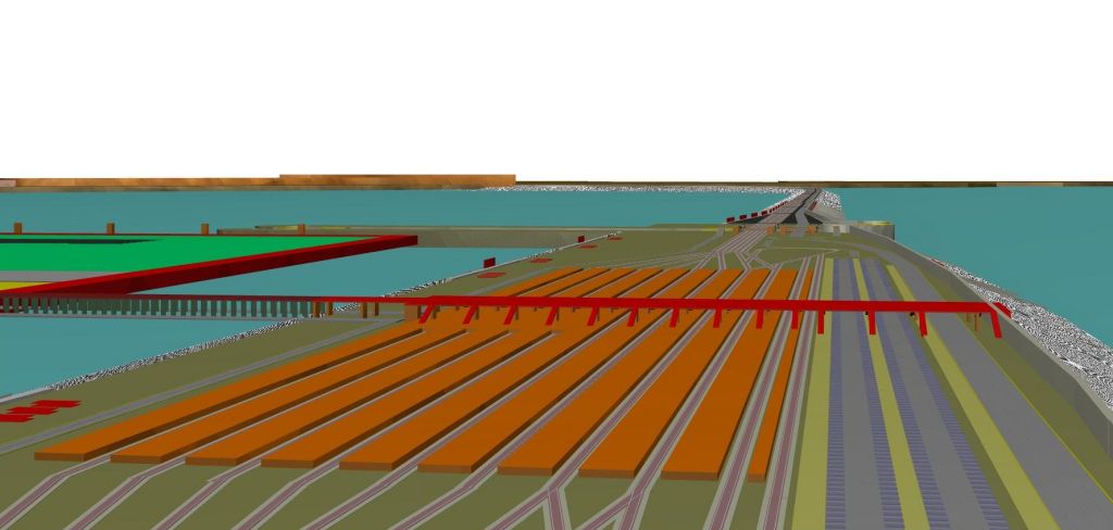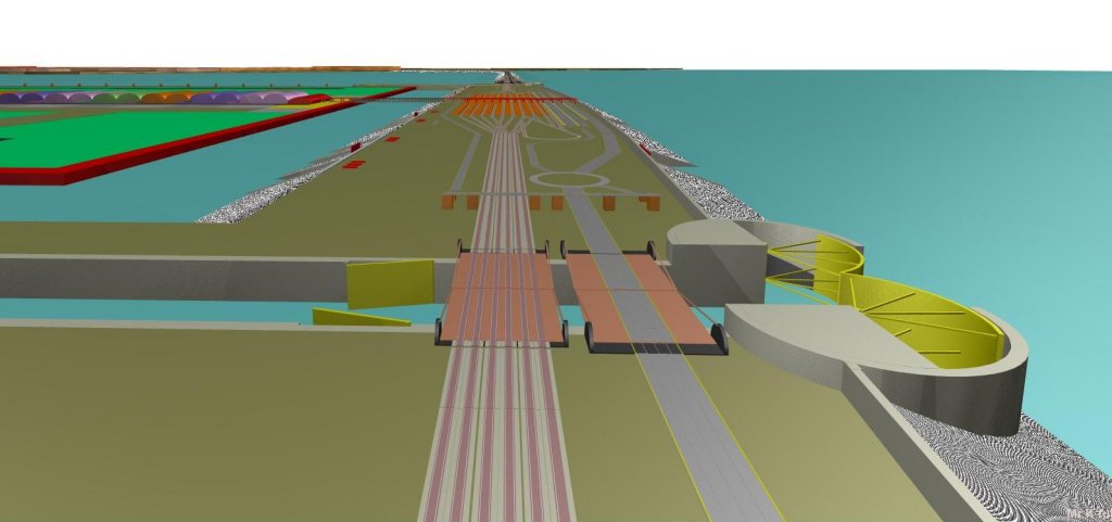 Proposed shipping locks with flood defence gates and bascule bridges for road and rail