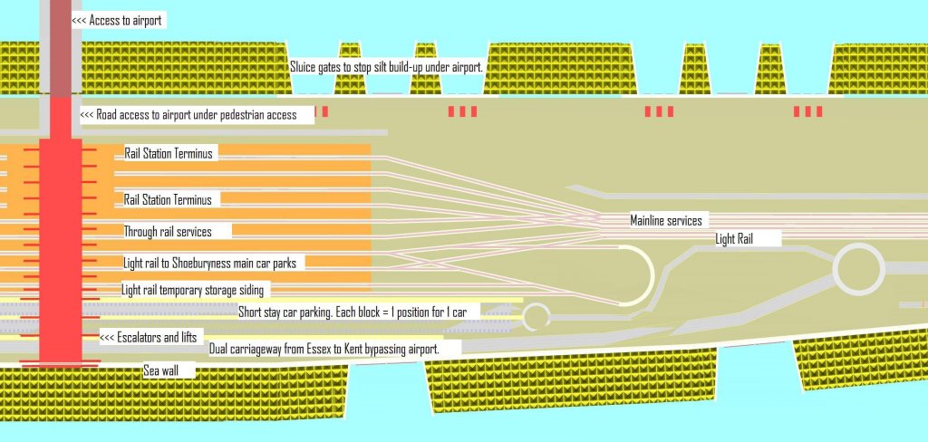 The floating airport is connected to the barrage and takes you immediately to the train station, light rail and short-term parking. Long term parking is accessed by a light rail shuttle service taking you from the airport station to Shoeburyness or the Isle of Sheppey.