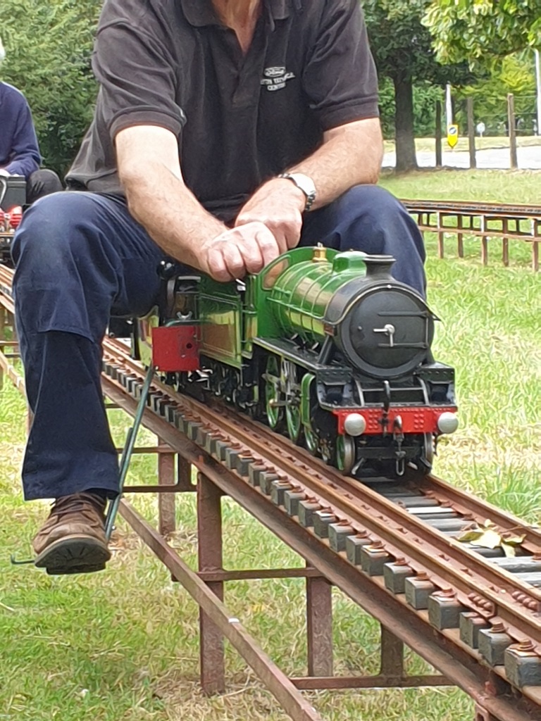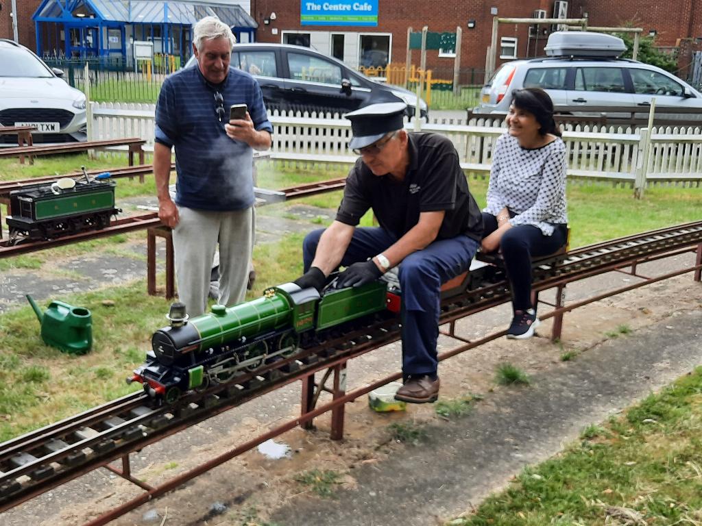 Chamios is a wonderful looking engine but being a 3 1/2inch gauge loco she unfortunately does not have the weight to power ratio to haul a pair of normal public ride on carriage's. Can be seen here (above) hauling a single ride on carriage. |