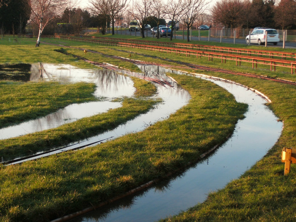 The dyke drainage pipe and first bend of the outer track. |